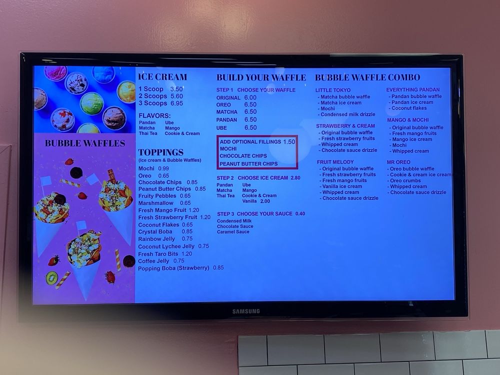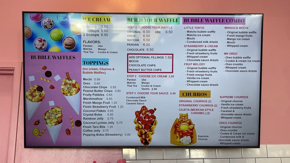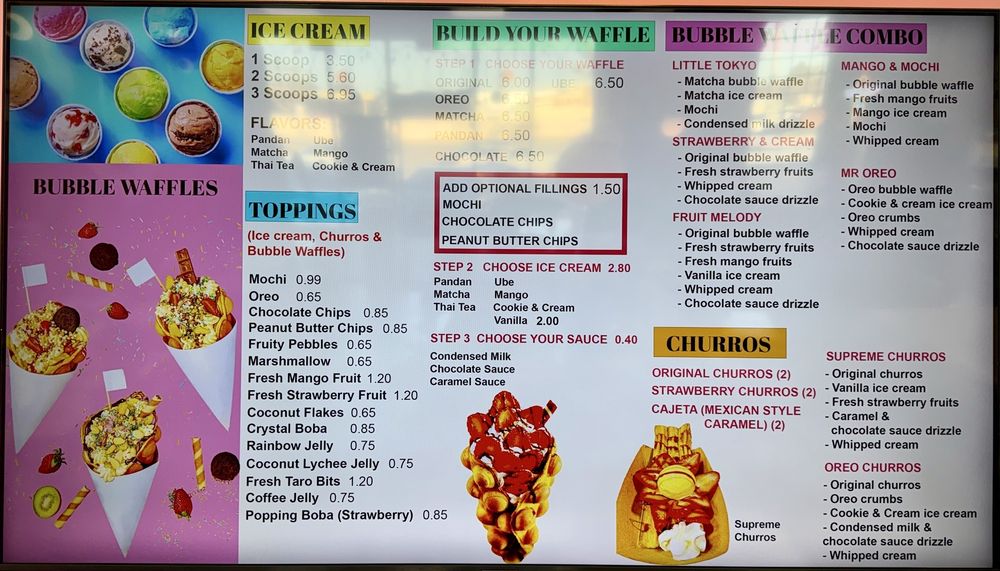 Original egg bubble waffle, mango ice cream, fresh mango fruits, mochi topping, served with whip cream